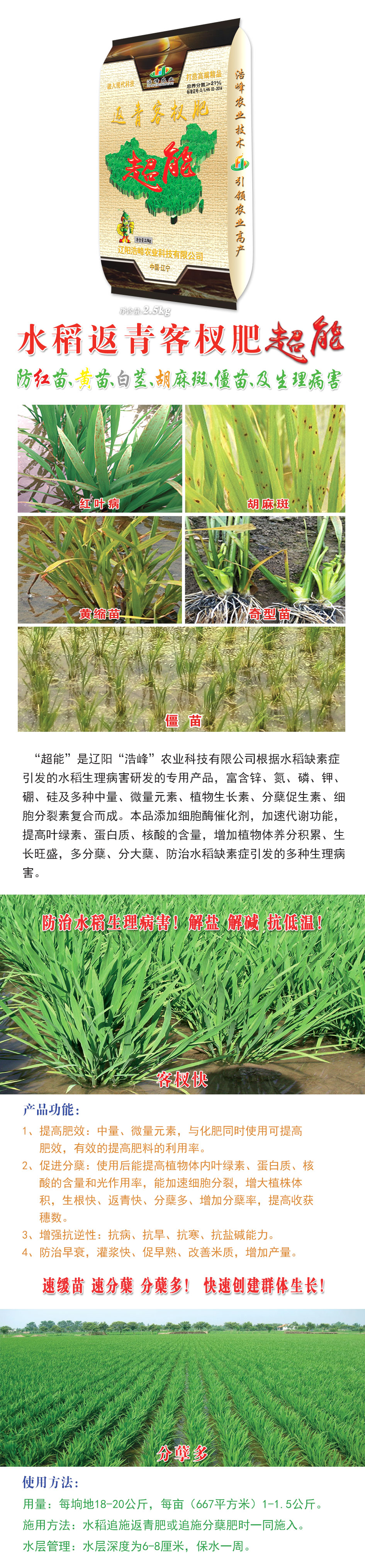 “超能”是遼陽“浩峰”農(nóng)業(yè)科技有限公司根據(jù)水稻缺素癥引發(fā)的水稻生理病害研發(fā)的專用產(chǎn)品,富含鋅、氮、磷、鉀、硼、硅及多種中量、微量元素、植物生長素、分蘗促生素、細(xì)胞分裂素復(fù)合而成。本品添加細(xì)胞酶催化劑,加速代謝功能,提高葉綠 、蛋白質(zhì)、核酸的含量,增加植物體養(yǎng)分積累、生長旺盛,多分蘗、分大蘗、防治水稻缺素癥引發(fā)的多種生理病害。