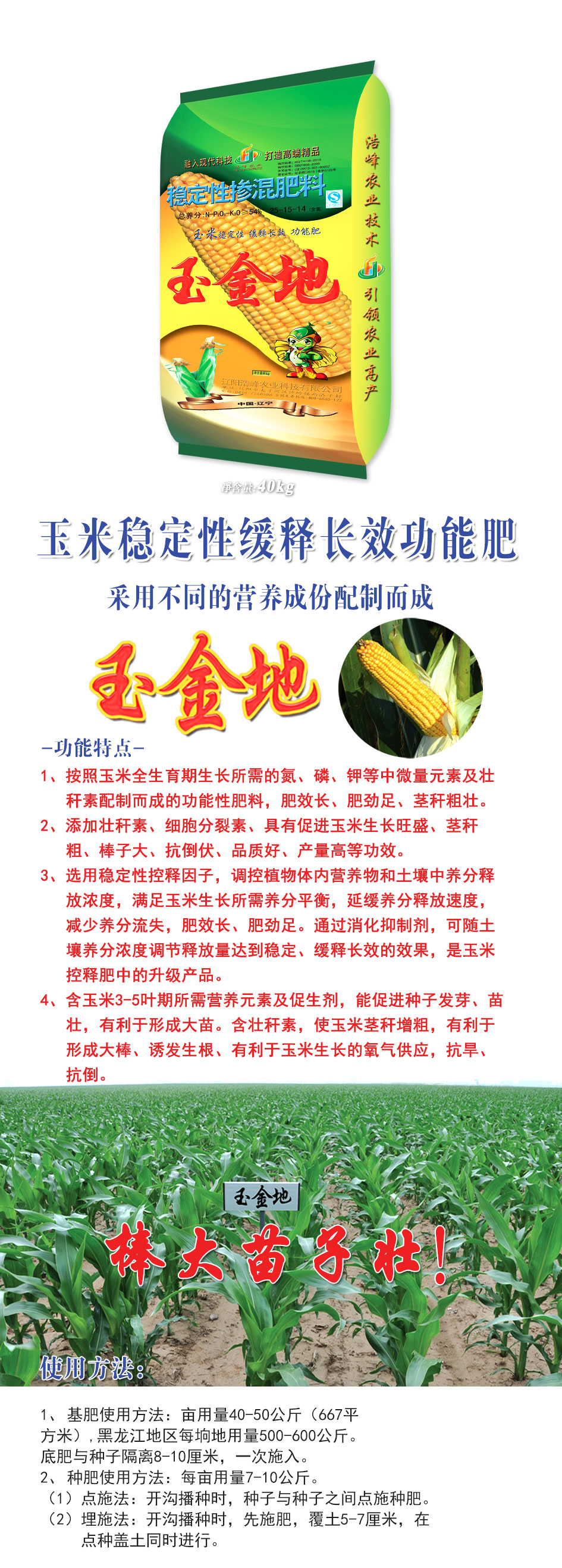 1、按照玉米全生育期生長所需的氮、磷、鉀等中微量元素及壯稈素配制而成的功能性肥料,肥效長、肥勁足、莖稈粗壯。