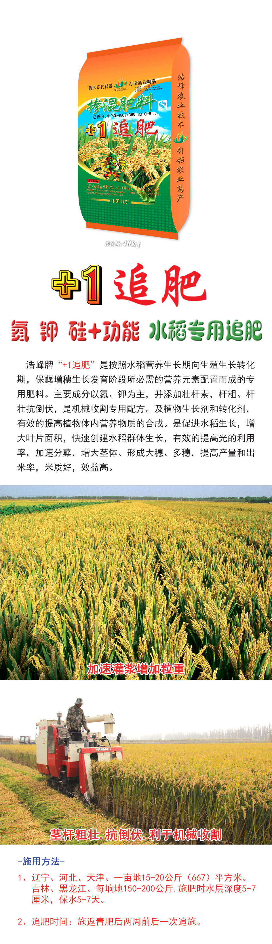 浩峰牌“+1追肥”是按照水稻營養(yǎng)生長期向生殖生長轉化期,保蘗增穗生長發(fā)育階段所必需的營養(yǎng)元素配置而成的專用肥料。主要成分以氮、鉀為主,并添加壯桿素,桿粗、桿壯抗倒伏,是機械收割專用配方。及植物生長劑和轉化劑,有效的提高植物體內(nèi)營養(yǎng)物質(zhì)ず銑傘J譴俳舊ぃ齟笠鍍婊?,繝F俅唇ㄋ救禾逕?,有效的提高光的利用率。尖欃分蘖,札e缶ヌ濉⑿緯紗笏?、多穗,提高产量航y(tǒng)雒茁?,米质好,效益高?