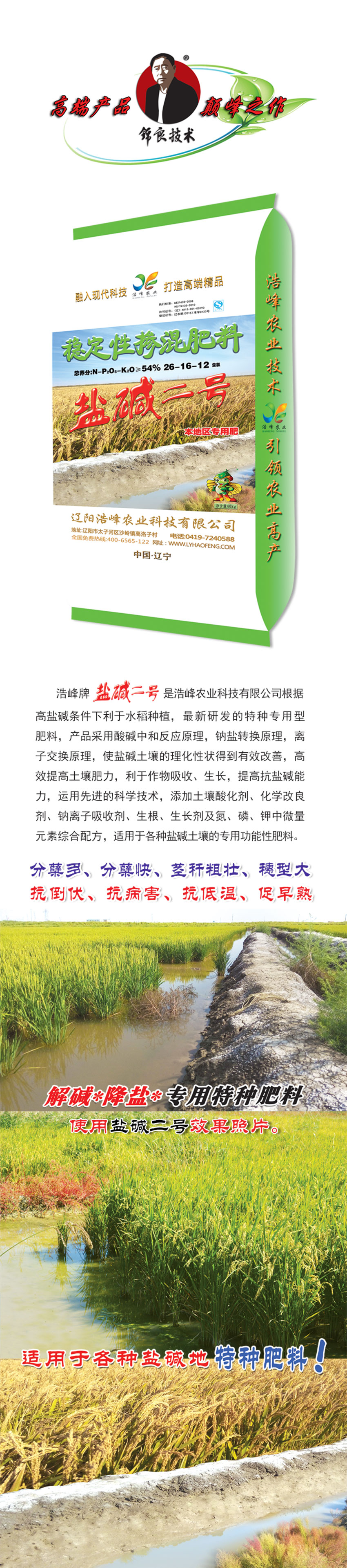 浩峰牌鹽堿二號(hào)是浩峰農(nóng)業(yè)科技有限公司根據(jù)高鹽堿條件下利于水稻種植,最新研發(fā)的特種專用型肥料,產(chǎn)品采用酸堿中和反應(yīng)原理,鈉鹽轉(zhuǎn)換原理,離子交換原理,使鹽堿土壤的理化性狀得到有效改善,高效提高土壤肥力,利于作物吸收、生長(zhǎng),提高抗鹽堿能力,運(yùn)用先進(jìn)的科學(xué)?,添加土壤藥F?、化学改良剂、脑u(píng)胱游占?、生根、生长剂及氮、磷、钾中微量元素综簢?shù)穭Μ室暶釉嶗种盐煎{寥賴淖ㄓ霉δ芐苑柿稀?